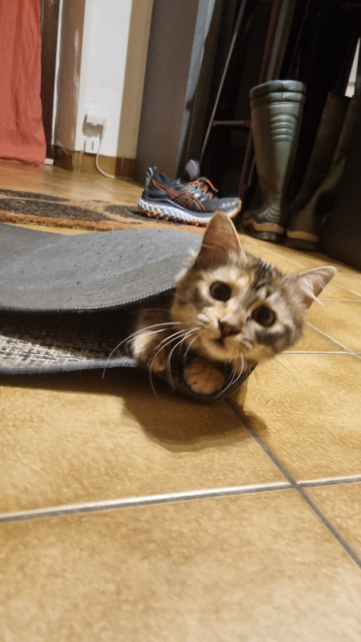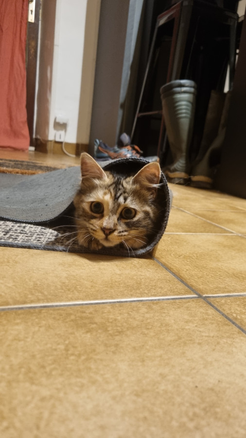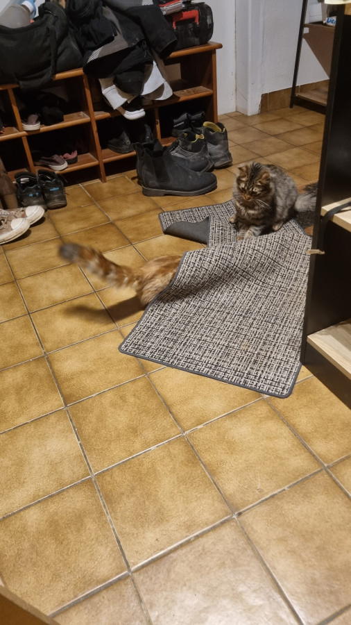 Elle est super marrante, complètement à l'ouest elle passe du coq à l'âne, n'a aucune logique dans ses actions, la voir vivre donne le tournis ! Elle est très, très, très câline et a le ronronnement facile. Une vraie perle : moi qui rêvais depuis toute gamine d'avoir une tricolore à poils longs ... Je suis comblée Elle a fêté ses trois ans depuis peu.