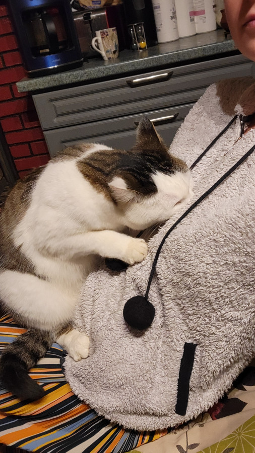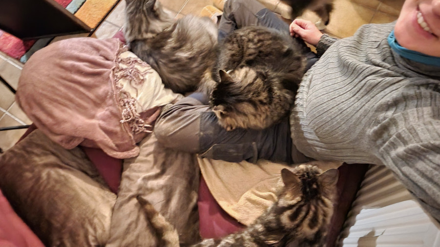 Aku est un chat bizarre : il agit encore comme un chaton à bien des égards, énormément de complaintes, de besoins de câlins, il ne respecte PAS DU TOUT le consentement des autres chats et se prend des baffes tous les jours car ils se jettent sur les autres pour avoir des bisous ... Il est très, très peureux mais ça commence à se calmer, il était temps .... Son point positif ? Il est splendide Il a maintenant quatre ans.