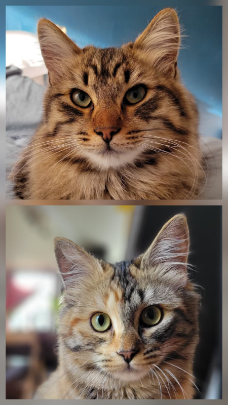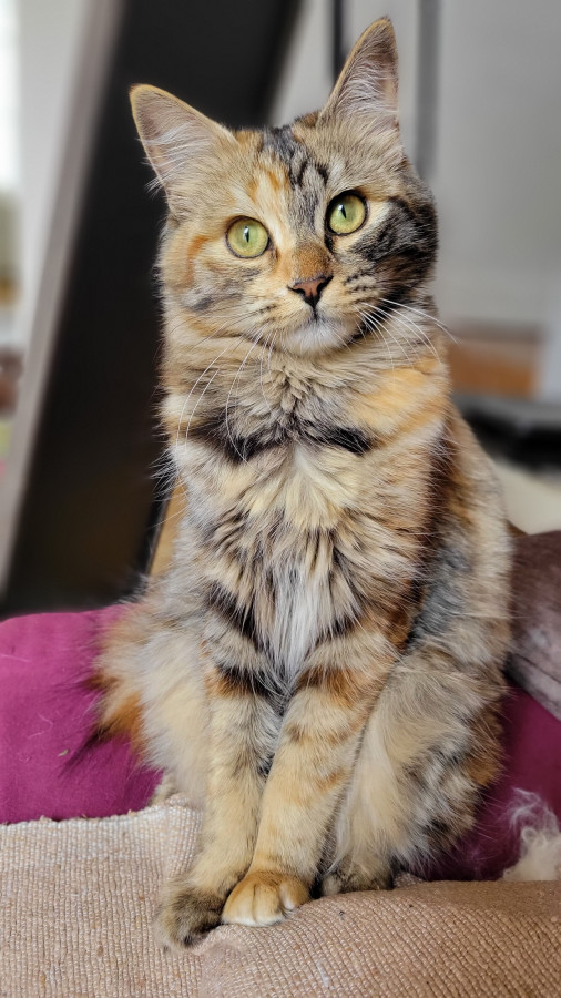 Elle est super marrante, complètement à l'ouest elle passe du coq à l'âne, n'a aucune logique dans ses actions, la voir vivre donne le tournis ! Elle est très, très, très câline et a le ronronnement facile. Une vraie perle : moi qui rêvais depuis toute gamine d'avoir une tricolore à poils longs ... Je suis comblée Elle a fêté ses trois ans depuis peu.