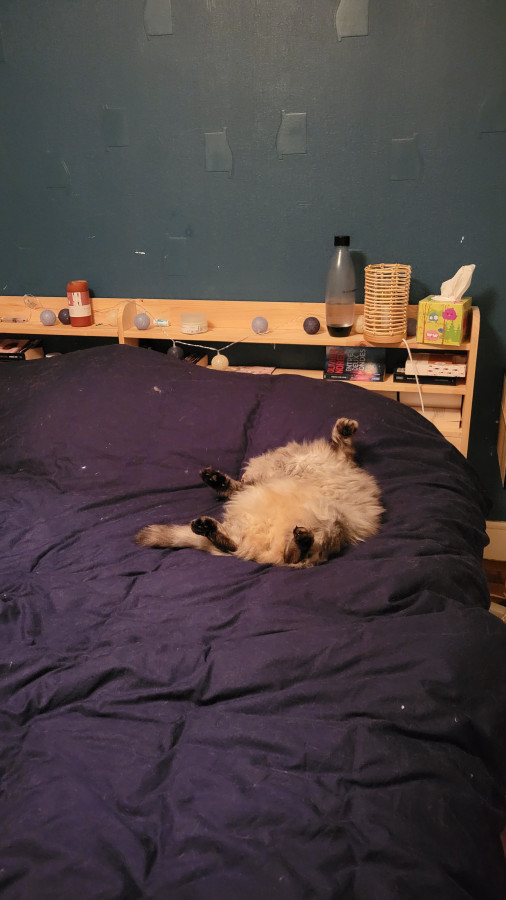 Aku est un chat bizarre : il agit encore comme un chaton à bien des égards, énormément de complaintes, de besoins de câlins, il ne respecte PAS DU TOUT le consentement des autres chats et se prend des baffes tous les jours car ils se jettent sur les autres pour avoir des bisous ... Il est très, très peureux mais ça commence à se calmer, il était temps .... Son point positif ? Il est splendide Il a maintenant quatre ans.