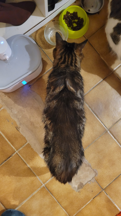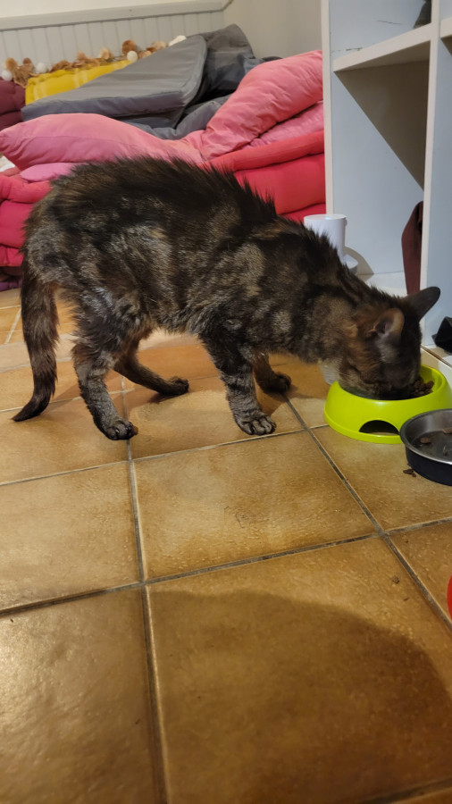 Il a réclamé à manger ce matin, il a bien avalé sa pâtée et là il est rentré après avoir fait le tour le maison. Il est aux croquettes là.