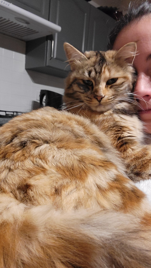 Elle est super marrante, complètement à l'ouest elle passe du coq à l'âne, n'a aucune logique dans ses actions, la voir vivre donne le tournis ! Elle est très, très, très câline et a le ronronnement facile. Une vraie perle : moi qui rêvais depuis toute gamine d'avoir une tricolore à poils longs ... Je suis comblée Elle a fêté ses trois ans depuis peu.