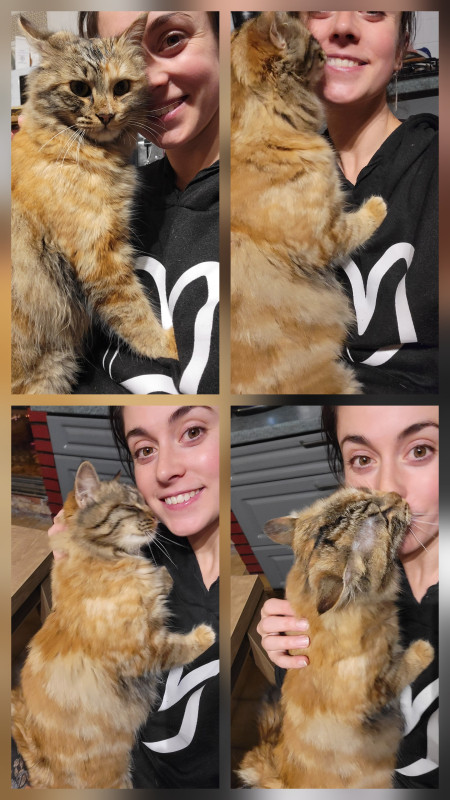 Elle est super marrante, complètement à l'ouest elle passe du coq à l'âne, n'a aucune logique dans ses actions, la voir vivre donne le tournis ! Elle est très, très, très câline et a le ronronnement facile. Une vraie perle : moi qui rêvais depuis toute gamine d'avoir une tricolore à poils longs ... Je suis comblée Elle a fêté ses trois ans depuis peu.
