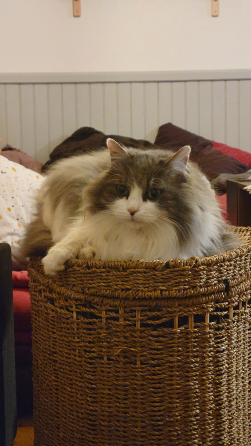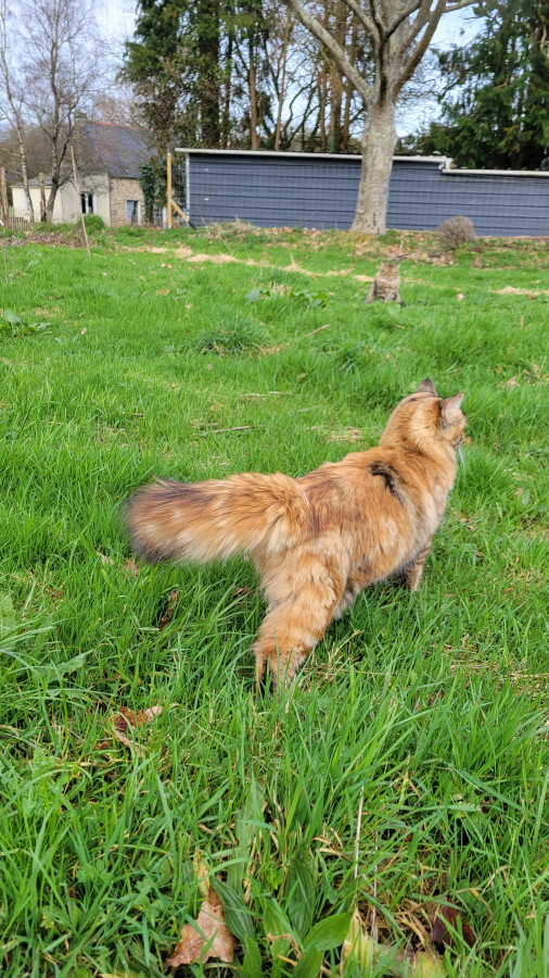 Elle est super marrante, complètement à l'ouest elle passe du coq à l'âne, n'a aucune logique dans ses actions, la voir vivre donne le tournis ! Elle est très, très, très câline et a le ronronnement facile. Une vraie perle : moi qui rêvais depuis toute gamine d'avoir une tricolore à poils longs ... Je suis comblée Elle a fêté ses trois ans depuis peu.