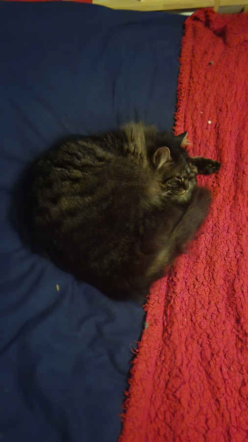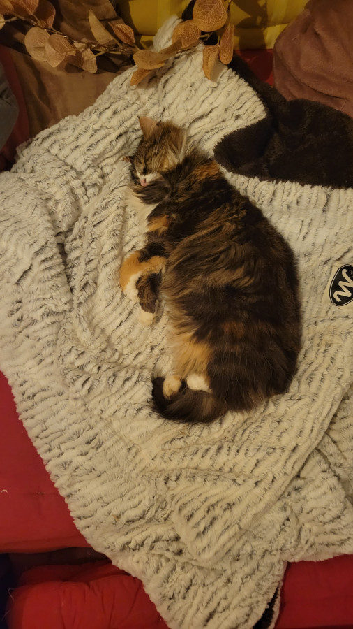 Elle est super marrante, complètement à l'ouest elle passe du coq à l'âne, n'a aucune logique dans ses actions, la voir vivre donne le tournis ! Elle est très, très, très câline et a le ronronnement facile. Une vraie perle : moi qui rêvais depuis toute gamine d'avoir une tricolore à poils longs ... Je suis comblée Elle a fêté ses trois ans depuis peu.