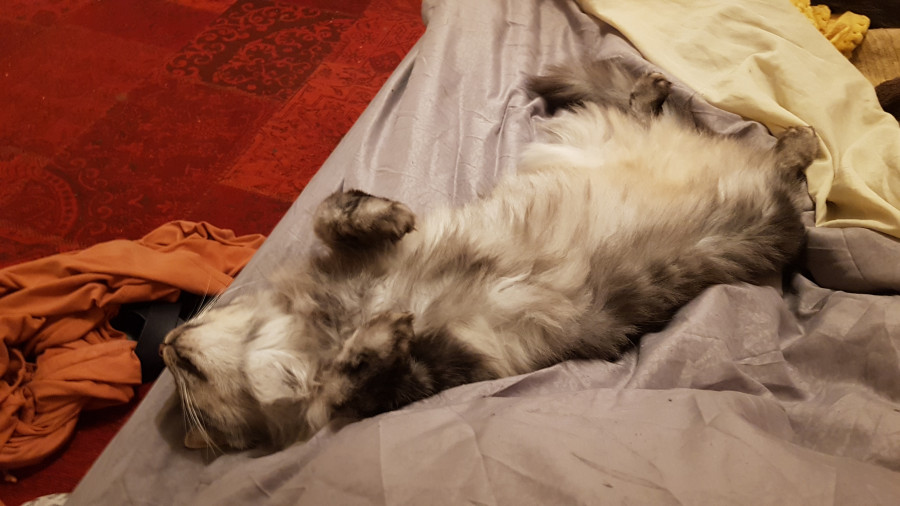 Si je suis dans mon lit avec l'ordi elle vient dormir sur moi, quand elle était petite elle dormait sur mon oreiller, si je suis assise au bureau elle dort dans sa boîte de transport rangée en dessous...