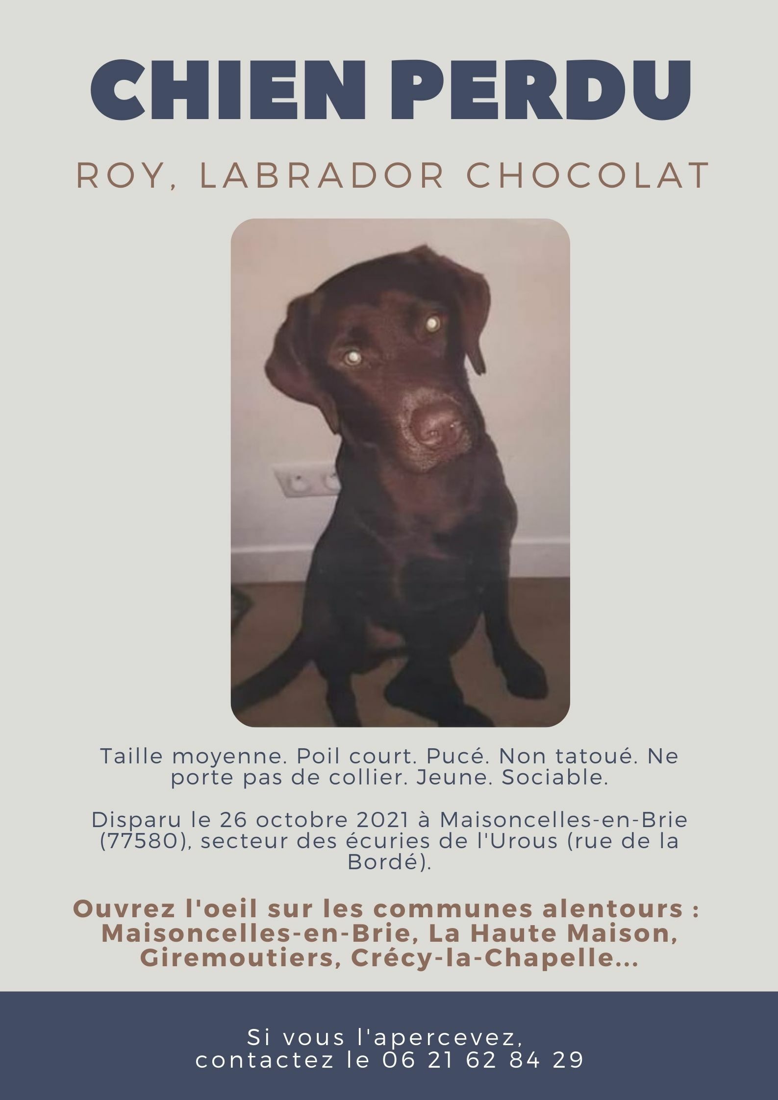 Je tente ma chance ici en me disant que plus l'annonce tournera, plus on augmente nos chances de le retrouver : le chien des écuries, notre petit "Roylito", labrador chocolat, a disparu depuis fin octobre à Maisoncelles-en-Brie !