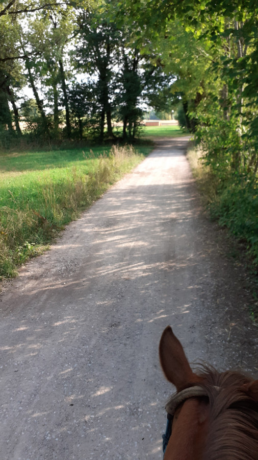 Ben je suis partie a cheval à 7h50 mais il faisait deja "tiede" 25° On est resté dans les bois (pas mal de taons quand même ) J'ai passé mon temps a surveiller l'encolure et d'ecraser les taons (gris) avec ma cravache (ah bon ce n'est pas fait pour ça une cravache ; bon c'est vrai sur un autre cheval je ne sais pas si ça le fait