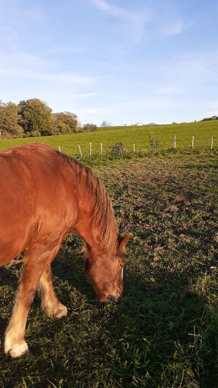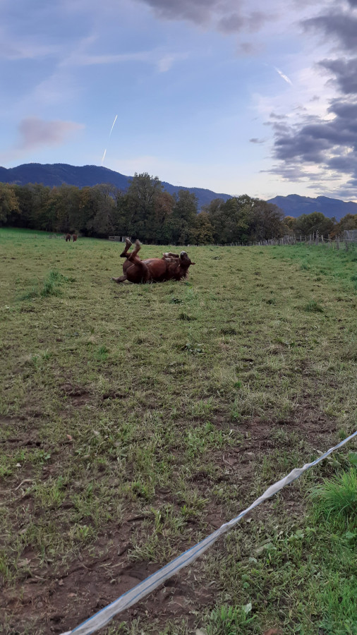 ensuite massage, picotin (avec appétit !!! entre le panier et le filet de nez il se sent brimé !) puis retour au pré.