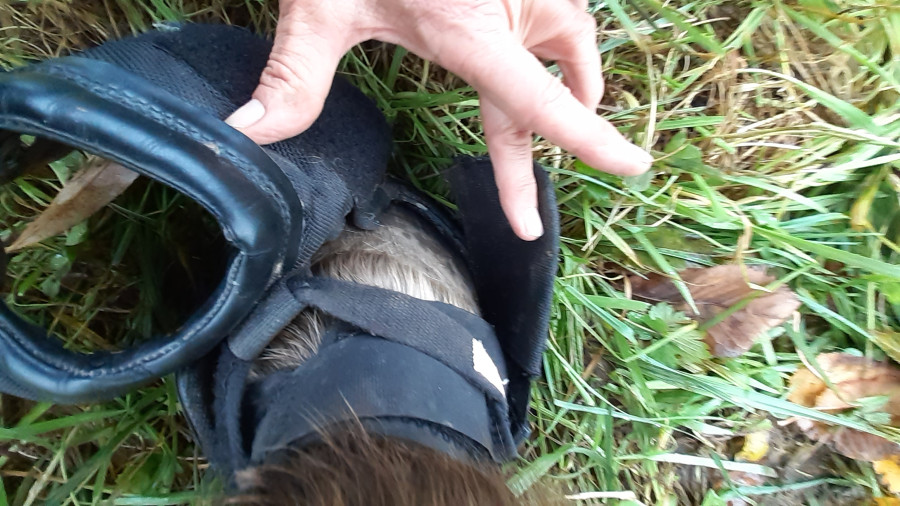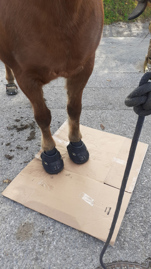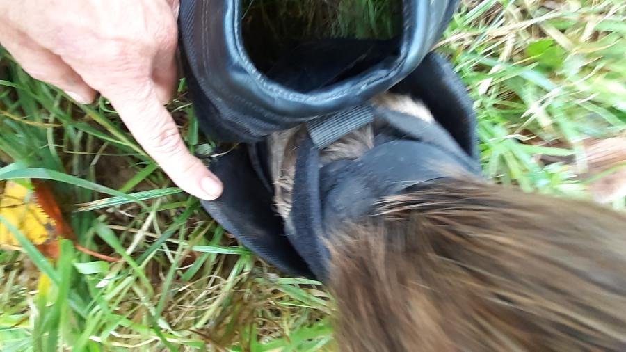 Crotte j'avais oublié les hipposandales ! On est allé les chercher à la maison, (petit crochet) j'en ai profité pour re tondre une touffe que j'avais mal faite, puis mettre du Sarnacuran, il y a des croûtes ! (qu'aux antérieurs mais bon)