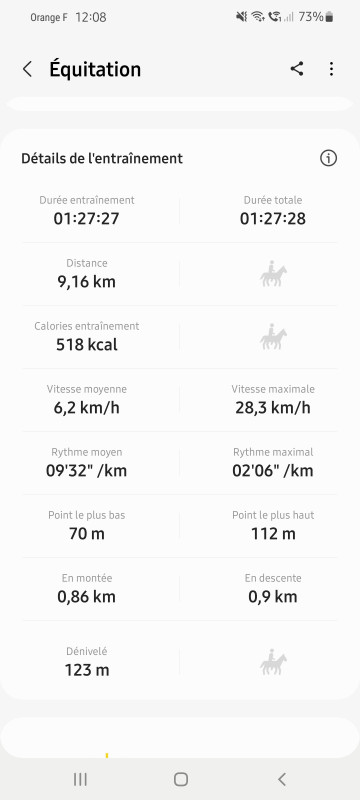 On a fait pas mal de pas mais aussi un peu de trot et une belle ligne droite au galop avec une petite pointe à 28 km/h (croyez moi, pour Fifi c'est bcp ) sans le pousser. Il commence à avoir envie d'avancer, c'est cool.