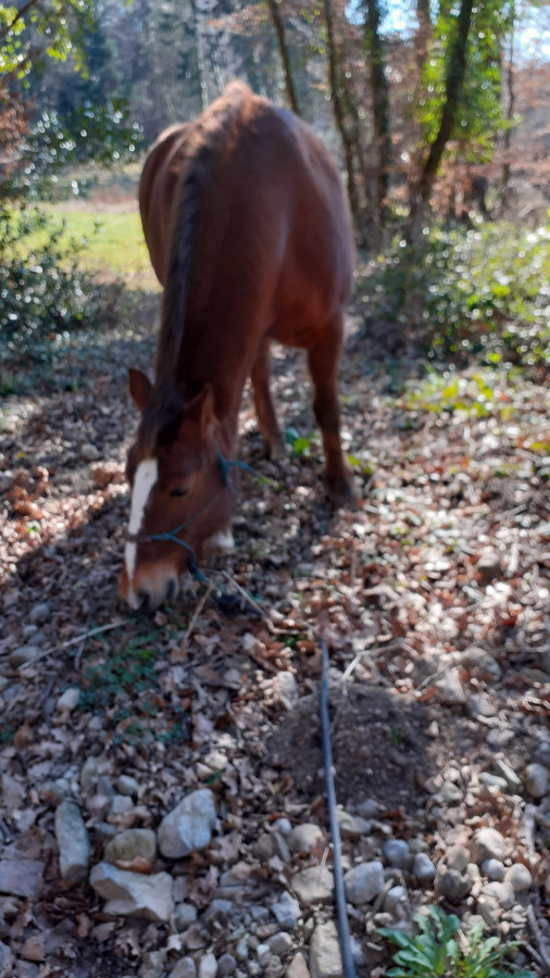 Nous , 3km en longe Mia etait vers l'abreuvoir quand je suis arrivée et est venue de suite (les autres aussi d'ailleurs ) On est sortie ,petit coup de brosse puis on est partie pieds nus . On a marché et mangé alternativement . Je trouvais qu'elle mangeait comme si elle avait faim (surtout au depart) et je trouvais même qu'elle semble avoir perdu du poids depuis notre seance de shiatsu ?!