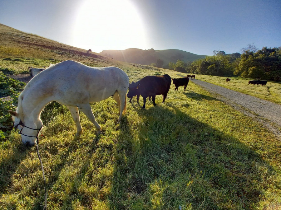 +4km à pieds ce matin, avec beaucoup de broute-broute. Les vaches étaient de sortie et les veaux super curieux, ils voulaient tous venir dire bonjour, mais avec les mamans juste à côté, on est restés prudents. Se faire sentir les fesses, OK, mais pas plus