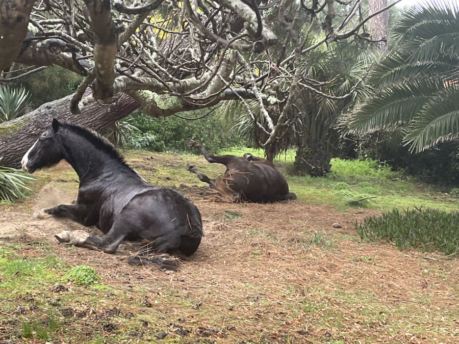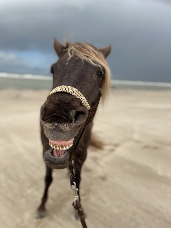 Son caractère: curieuse, intelligente comme un singe, très sûre d'elle, agile comme une gazelle, imprévisible et obstinée. ADORE maladivement l'eau (se fait des bains de sabots dans les abreuvoirs, se roule dans les étangs tout en grignotant les roseaux au passage, fonce dans les vagues pour se rouler dedans, enfonce ses naseaux très profondément quand elle boit pour faire des bulles).