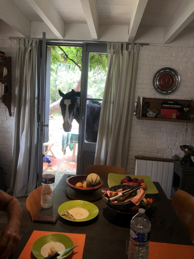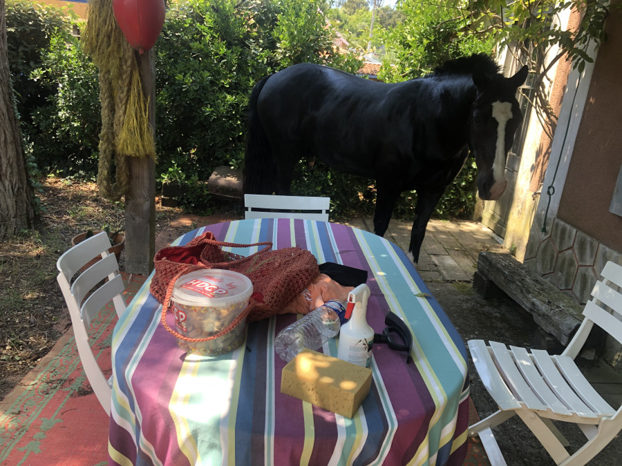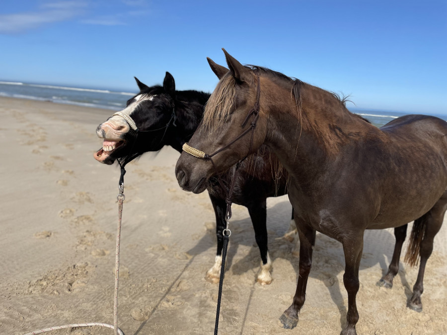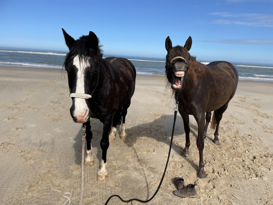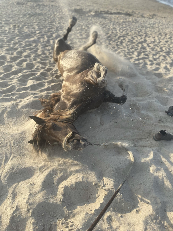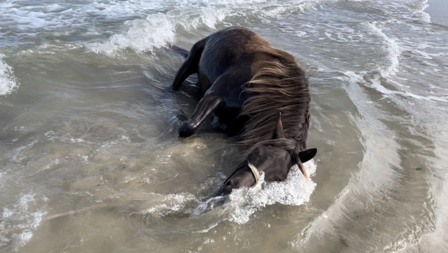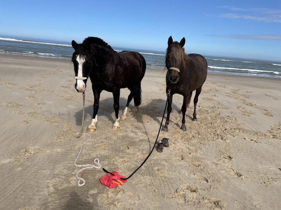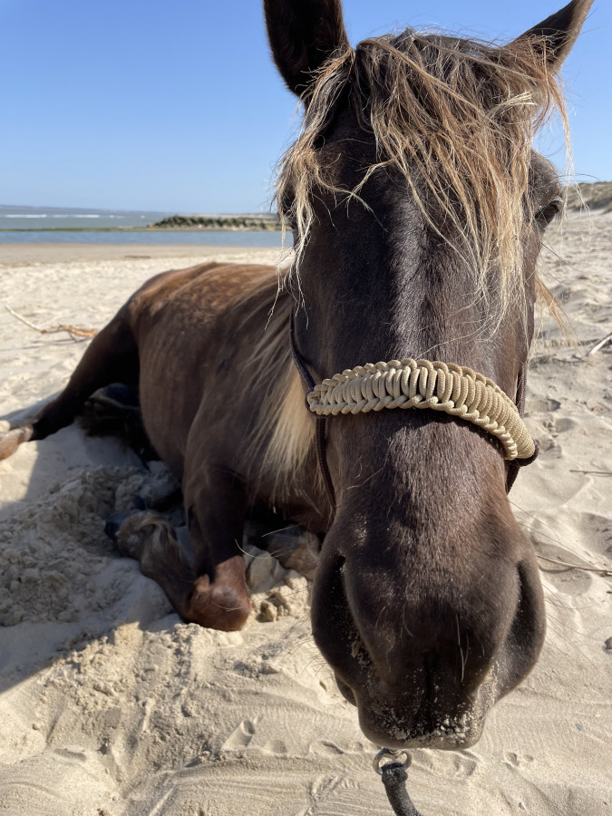 Routine de rêve: roulade dans le sable fin, puis bains, puis carottes, puis roulades. Sieste pour eux (pendant que je pèche quelques coquillages), et retour au pré pour pansage et pommes sucrées.