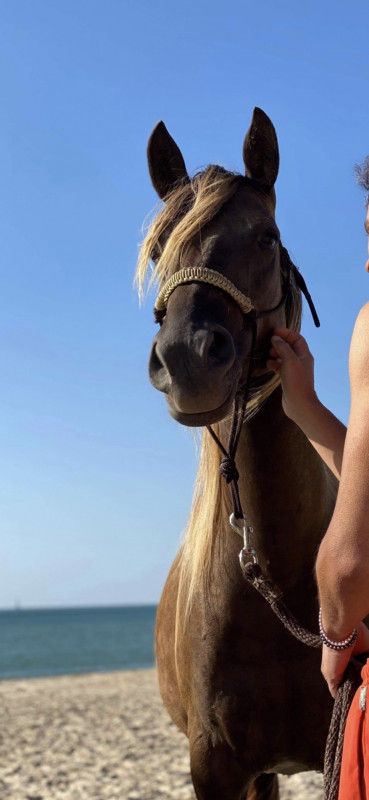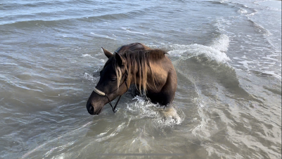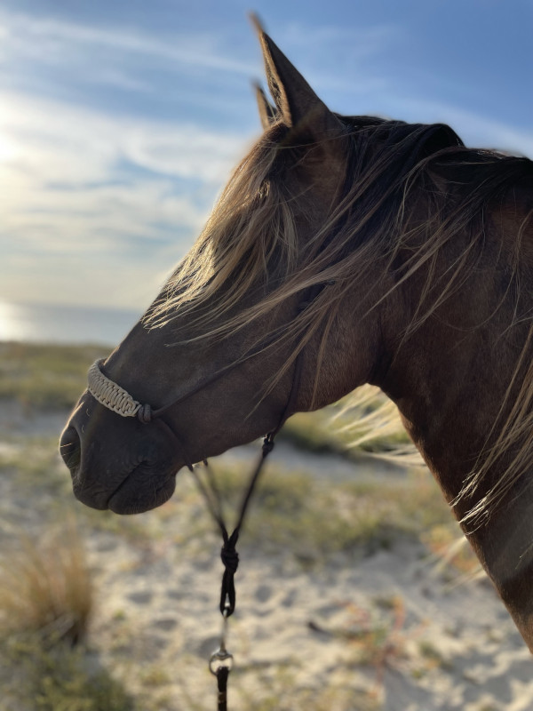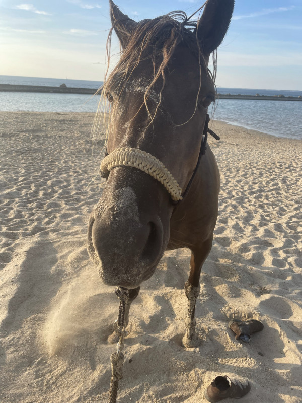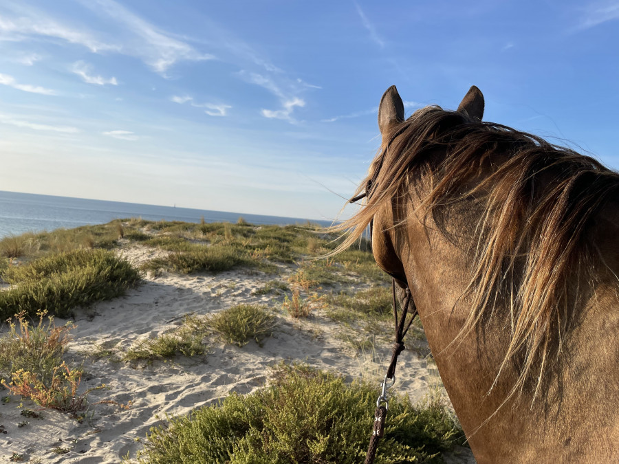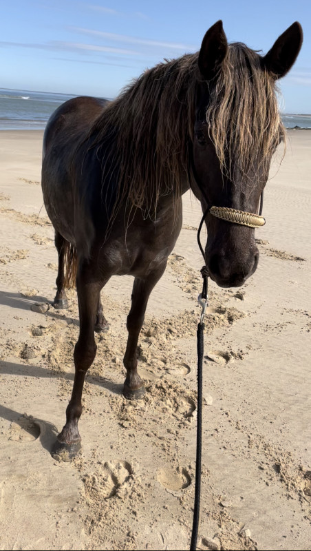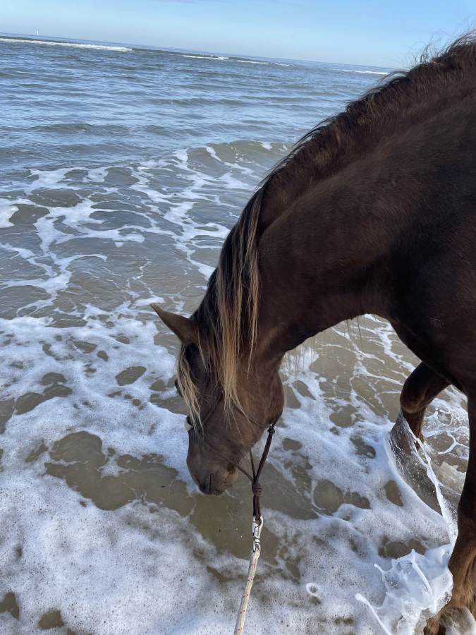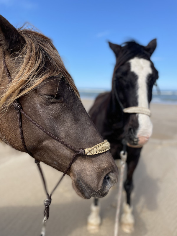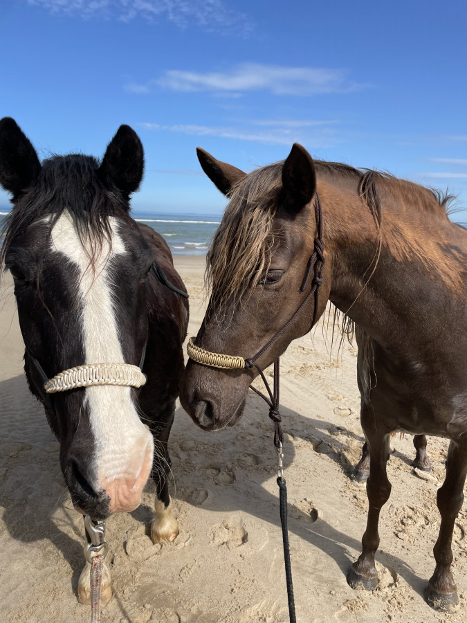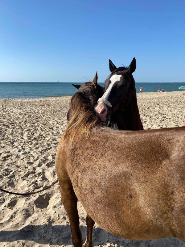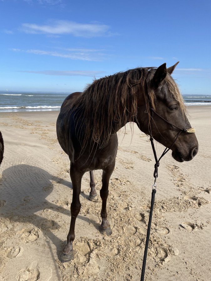 Me revoilà donc un cheval dans chaque main, une poche de carottes (pour le gouter des ptits après le bain), et hop direction la mer!