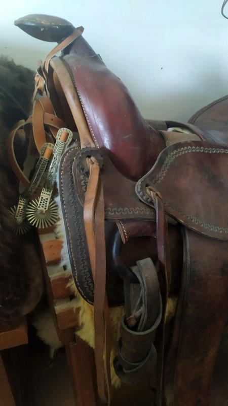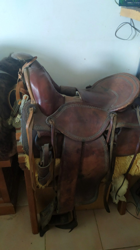Les riggings dee's, si bien en aluminium, datent typiquement de la fin 50 début 60. En effet après la WW2, plus d'acier de qualité, mais énormément d'aluminium des projets d'aéronefs avortés. Ils ne correspondent pas avec la taille des riggings leather ( Oui, oui, "fold's" pour les intégristes, ne commencez pas...). Leur positionnement qui semble en devant de la position "Full", laisse a penser un usage spécifique, peut être pour un "gaited horse", peut être même un bovin( cirque ?). Le "swell" fork et le siège "High rise", sont typique des années 60 aussi.