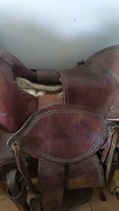 La selle semble en très bon état de conservation et semble avoir très peu servis, ce qui n'est pas en accord avec un remplacement de pièces. Mais dégats des eaux, rongeurs ? incendie ?