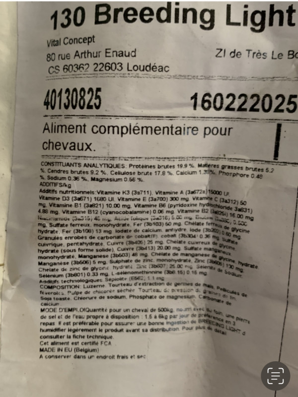 Le commercial Destrier était venu à la maison, il a fait le calcul de ma ration et a trouvé qu'elle était plus équilibrée que ce qu'il proposait, alors je ne me pose plus de question, j'arrête de me prendre la tête à courrir partout, et je fais selon mon ressenti par rapport au besoin du cheval.