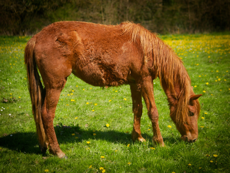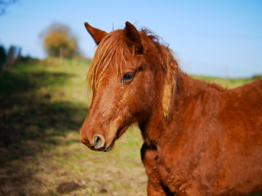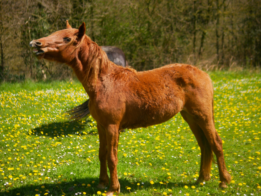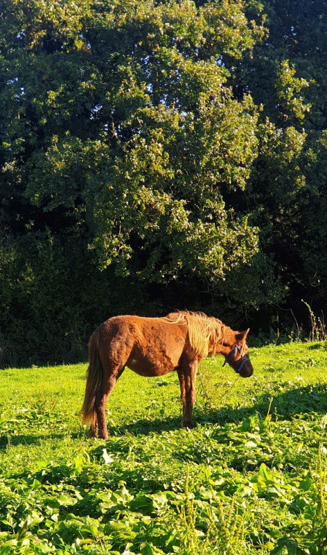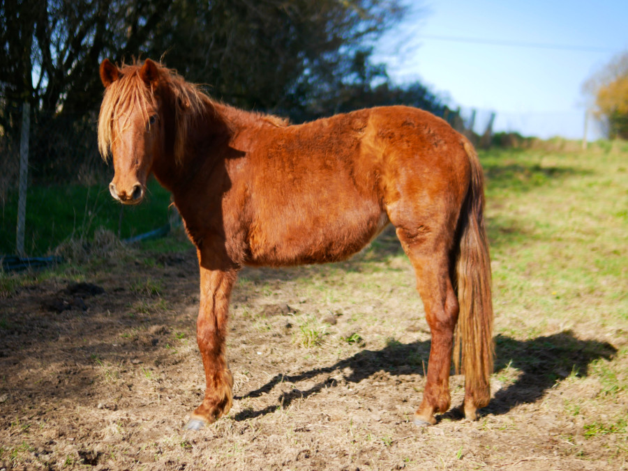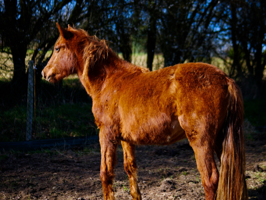 Pour l'histoire, c'est une pouliche d'1an orpheline à 3 semaines de vie, ayant eu des galères pas possible ensuite (accident = probable luxation de l'épaule non-soignée qui a donné une luxation chronique, gourme quasi-annuelle...). Elle est donc dans un état plus que limite et fait grossièrement la taille d'un poulain de 3 mois actuellement.