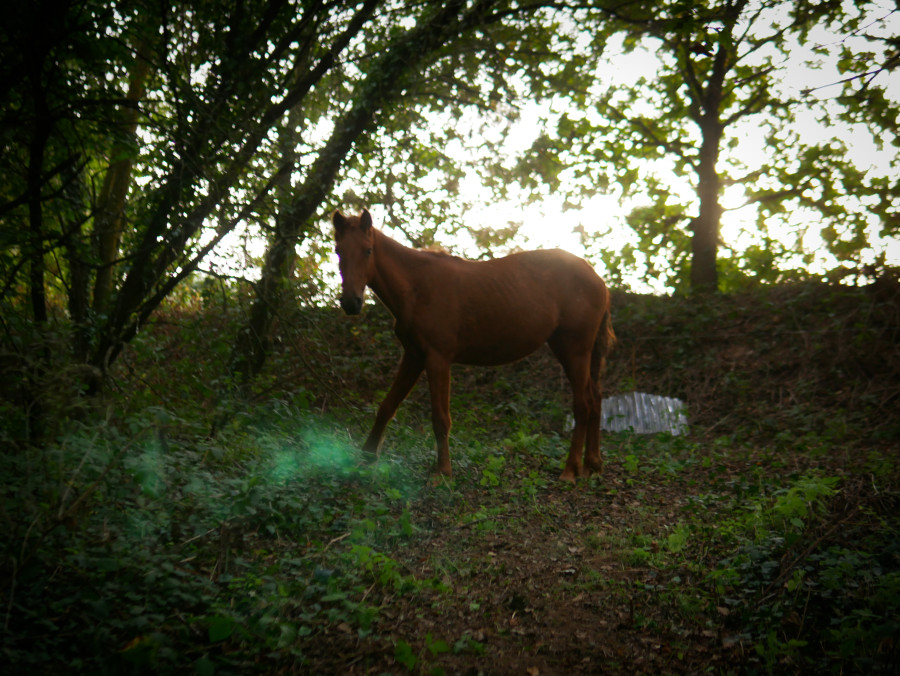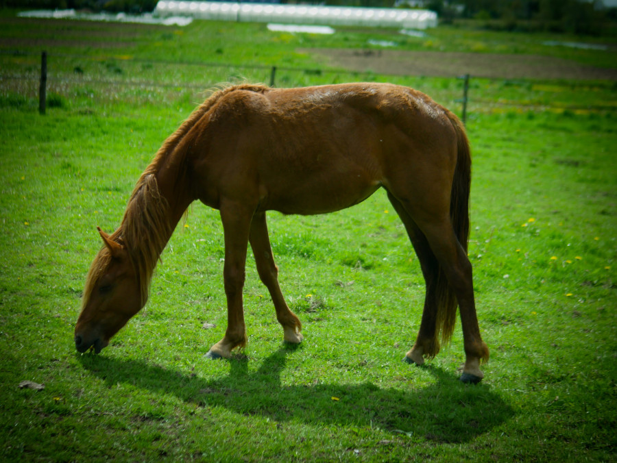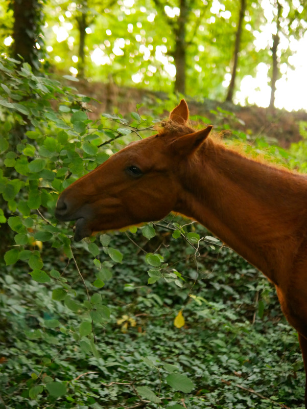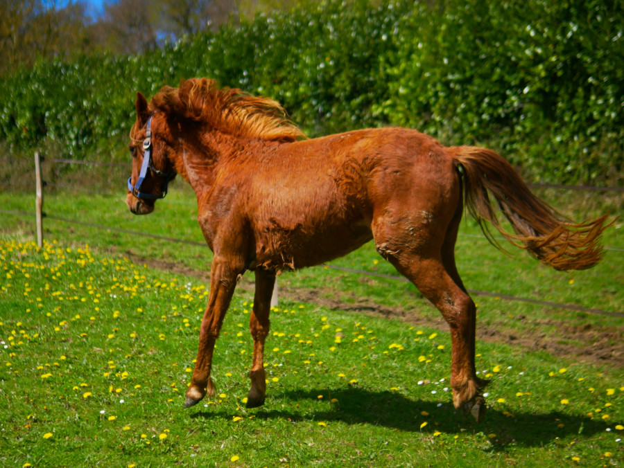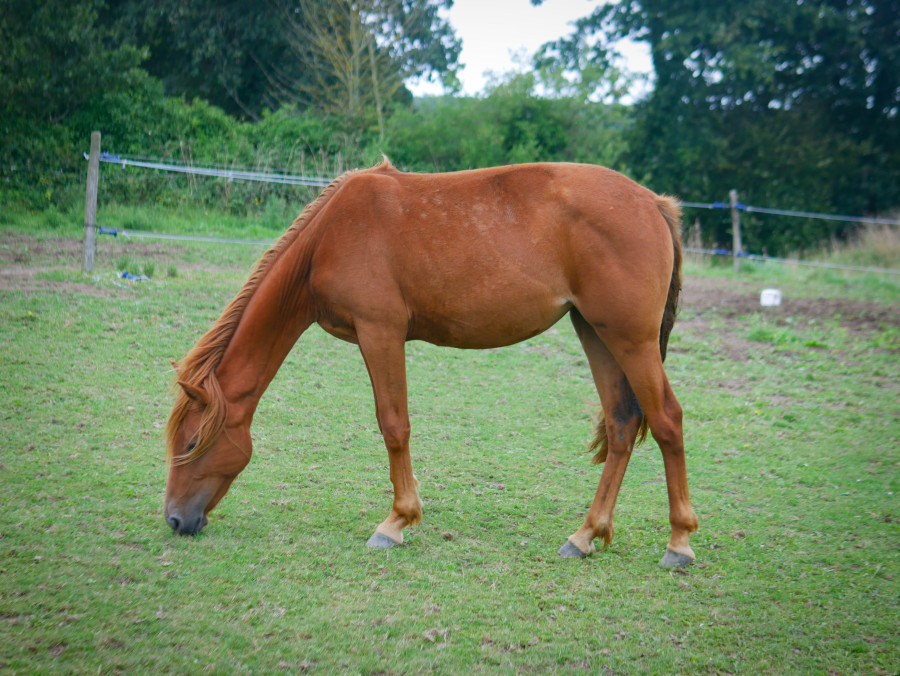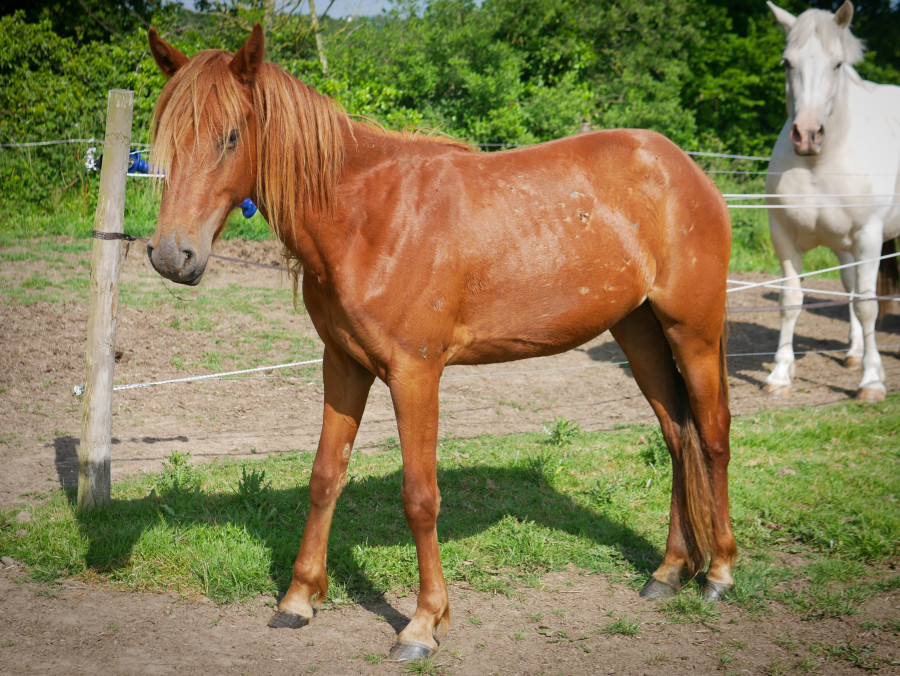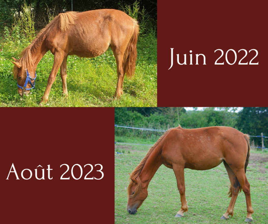 Pour l'histoire, c'est une pouliche d'1an orpheline à 3 semaines de vie, ayant eu des galères pas possible ensuite (accident = probable luxation de l'épaule non-soignée qui a donné une luxation chronique, gourme quasi-annuelle...). Elle est donc dans un état plus que limite et fait grossièrement la taille d'un poulain de 3 mois actuellement.