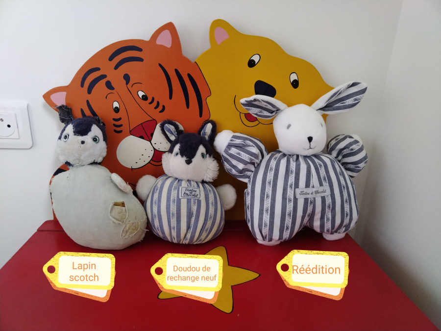 Lapin scotch est mon doudou qui a vécu la guerre et qui porte ce nom parce qu'il a été tellement rafistolé avec de l'elasto qu'il faisait plus d'1kg et que j'ai assommé ma s?ur avec XD. Là c'est sa dernière version de rafistolage . Mes parents avaient trouvé le même doudou pour pouvoir faire un roulement on peut bien voir a son état que je n'ai jamais voulu le prendre .