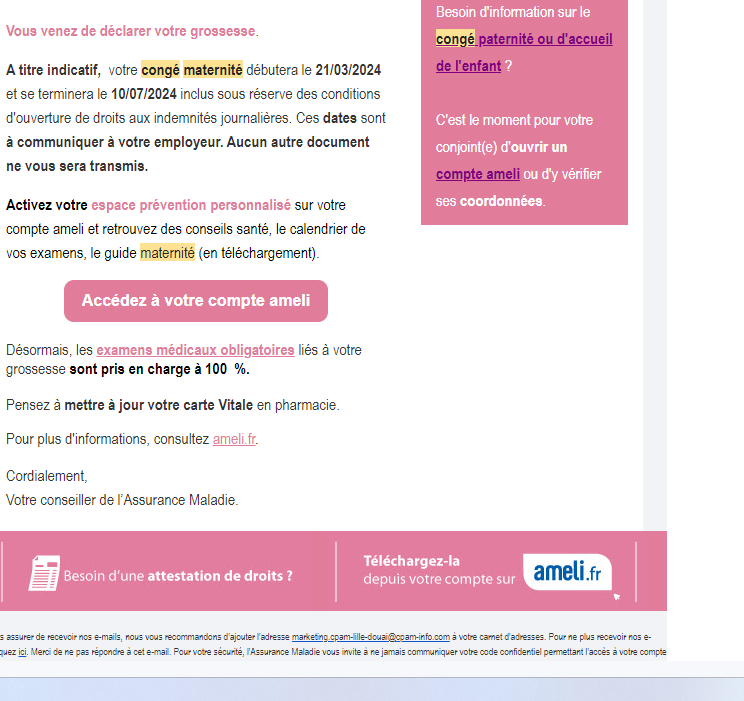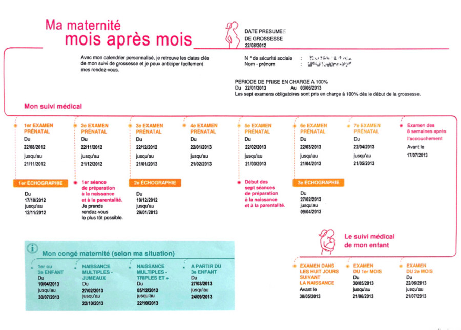 Moi j'ai reçu ça par mail : j'ai reçu ce mail le 2 novembre (date d'accouchement prévue le 1er mai) donc de mémoire, ça devait être juste après la 1ere echo quand la SF déclare la grossesse.