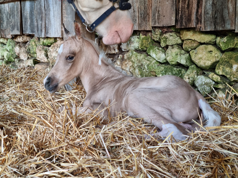 Le deuxième poulain devrait arriver mi-juin 2023 : un DSA à 77% de ma jument crème Flanelle et de l’époustouflant Ien’a Coari. Pile ou face pour la couleur, ce sera crème comme maman ou palo comme papa.