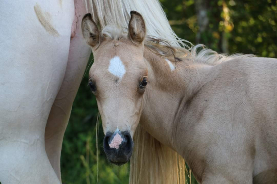 L’année 2022 a vu naître les 2 premiers produits de l’élevage. Un premier poulinage catastrophique malheureusement, le poulain s’est éteint à 3 jours malgré les soins. Je raconterai son histoire tragique un de ces jours. Le deuxième à l’inverse s’est déroulé comme dans un livre, et nous a offert une sublime pouliche palomino : Mousseline.