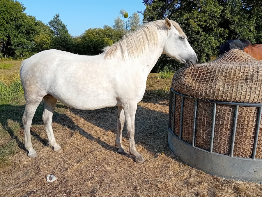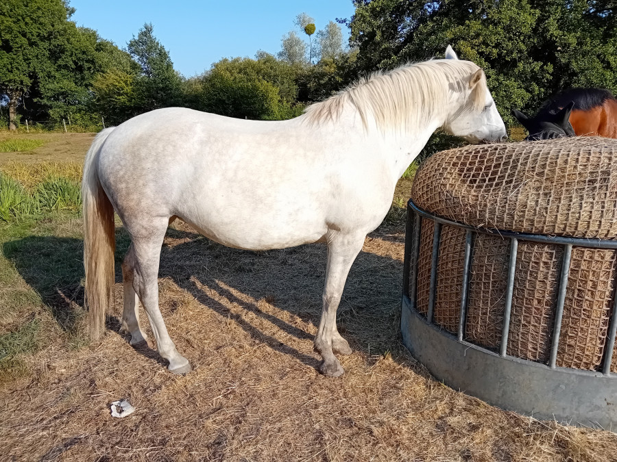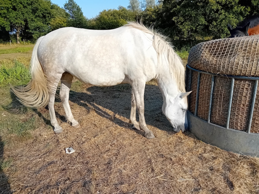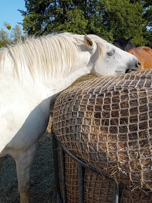 Elle était à part lorsque je suis arrivée (mais cela n'a rien d'exceptionnel pour elle). Elle venue directe quand elle m'a vue. Puis est allée à la botte de foin. Mais elle est sous filet et elle n'a pas pris le coup de dents. Le hongre y arrivait très bien...mais il avait repéré le trou dans le filet. Je lui ai tiré quelques bouchées pour l'encourager. Mais les taons et les mouches l'agaçaient fortement.