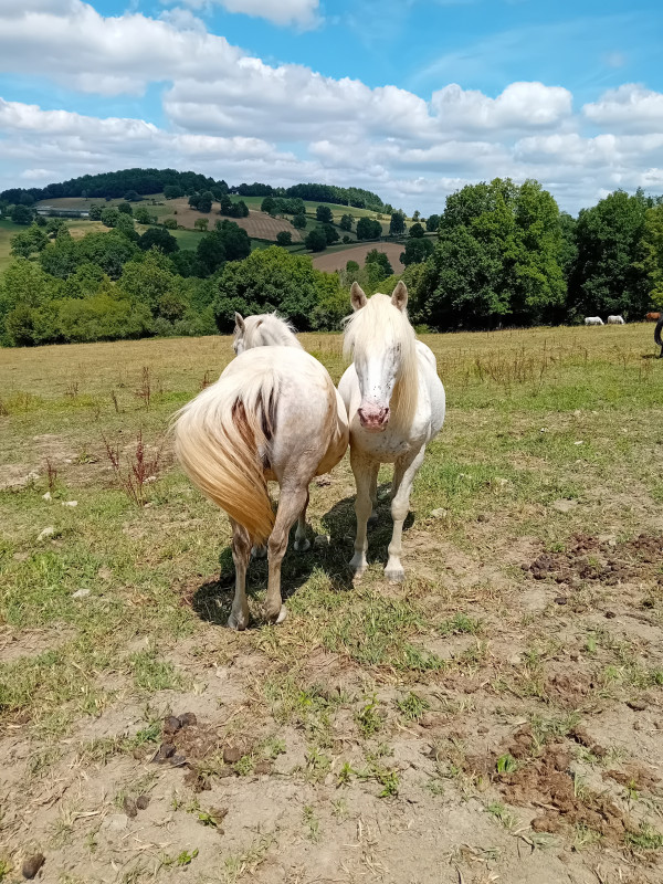 Petit troupeau de 4 (donc 5 avec Indra) : une comtoise et une SF , toutes deux pas toutes jeunes (une O et une U) un hongre PS qui partira à la fin du mois, et un SF qui vient d'arriver, gentil mais un peu mode brutus envahissant.
