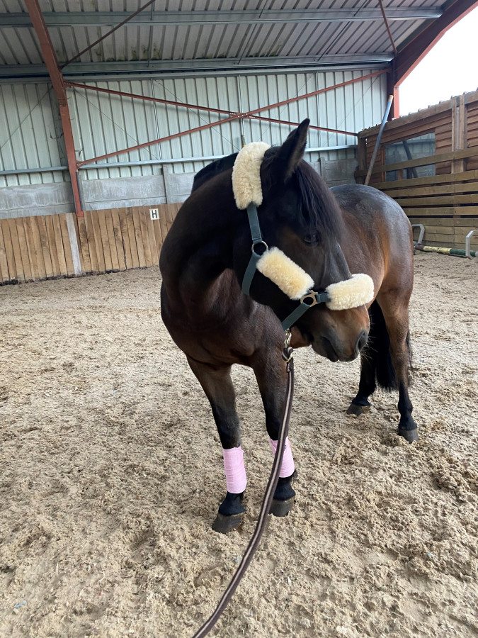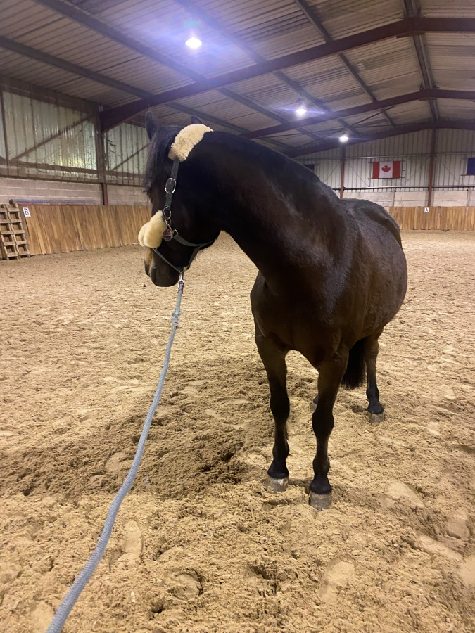 Hier il y avait du monde aux écuries donc on s'adapte, j'ai attendu un peu mais j'ai du faire ma séance de travail à pied pendant qu'une autre propriétaire longeais. On a principalement travaillé les bases : marche/arrêt (stick to me). Après l'avoir remis un peu aux ordres et quand je le sentais plus avec moi, moins dans le conflit on a travaillé deux trois reculés et un reste puis viens.