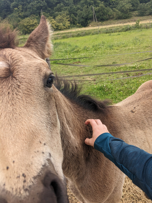 Ici le mode gratouilles sur Origan a bien progressé, on peut lui en faire maintenant un peu partout et j'ai même tenté ma chance en prenant/levant les antérieurs, ce qu'il a tout gentiment fait.