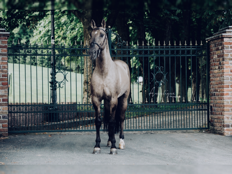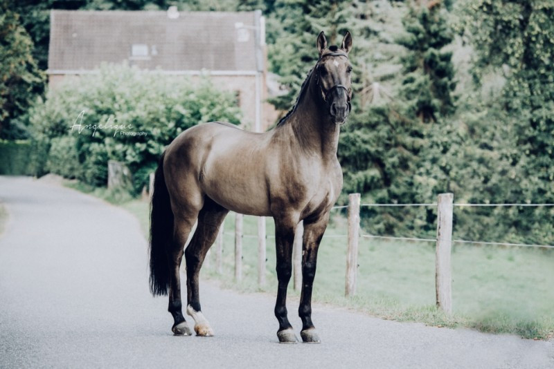 En deuxième choix, il y a le beau Don Malagueño (Inefavel). C'est un lusitanien smoky grullo (Ee aa/homozygote sur le Dun). Il est stationné en Allemagne mais des doses sont disponibles en France. Il est travaillé actuellement par la cavaliere de Grand Prix Hester Bischot. Son modèle me plaît beaucoup et sa robe est un gros plus pour moi qui adore les Dun, mais, j'ai un peu peur de me retrouver avec un poulain trop délicat (les lusitaniens ne sont pas réputés pour leur facilité et le croisement avec de l'allemand peut être explosif). En effet, je n'ai aucun retour sur son degré de "rideability". De plus, il toise 1m63 et j'aimerais éviter de produire un nain (même s'il y a peu de risque au vu de la taille de ma jument).