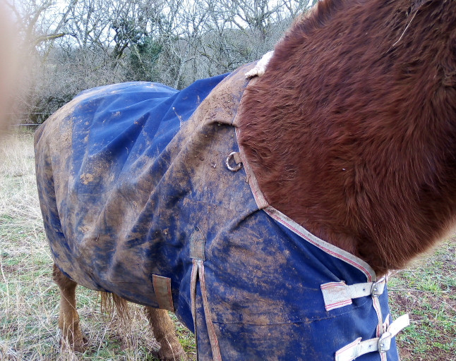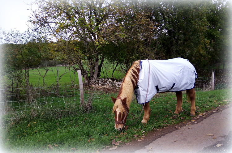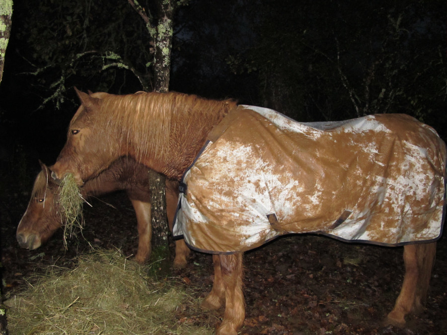 Cette année, elle a changé de pension et elle a son imper' depuis fin novembre car la responsable me dit que ses champs sont très humides et qu'il vaut mieux lui mettre. Je me dis qu'elle connait mieux ses écuries que moi, donc même si je suis plutôt adepte du "à poils" je lui ai mis son imper'. Je précise que malgré ses origines, elle n'est absolument pas en mode nounours ambulant genre shetland, elle a plutôt un petit poil tout soyeux mais qui semblait tout de même la protéger correctement jusque là Je précise aussi qu'il y a un abri dans le champ (mais en fait il y a deux côtés protégés et un troisième où ce sont les ballots de paille / foin qui sont posés derrière des fils mais il y a pas mal d'air quand même de mon point de vue de bipède frileuse ^^ Par contre il est bien paillé! ), pour l'instant je ne l'ai jamais vue dedans...