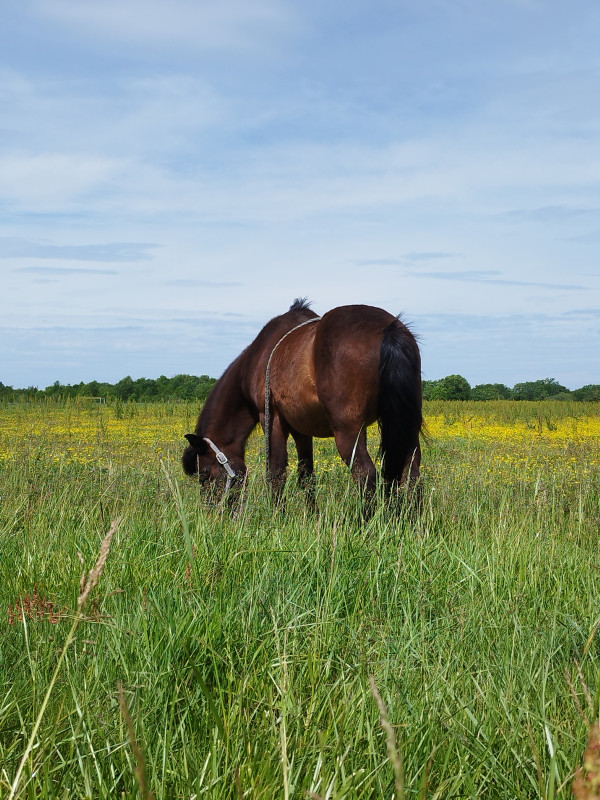 Il n'a plus le même voisin de pré (contre son pré, c'est un paddock pour les chevaux de la pension box, qui vont au paddock toute la journée), d'habitude c'est une jument qu'il aime bien, là c'est un cheval que je n'avais jamais vu. Il l'aime bien, je le vois souvent rester avec lui près de la clôture plutôt avec ses coloc, c'est mignon
