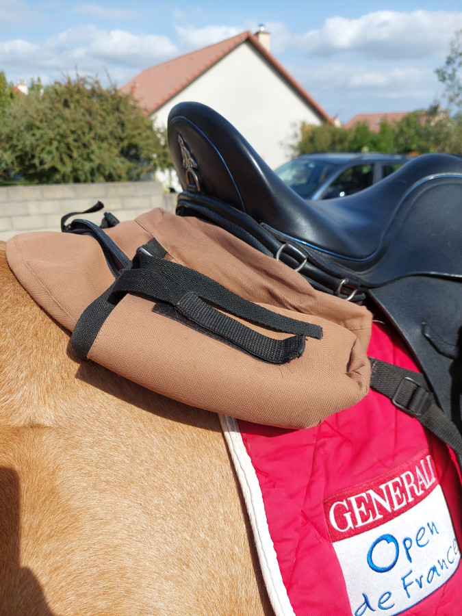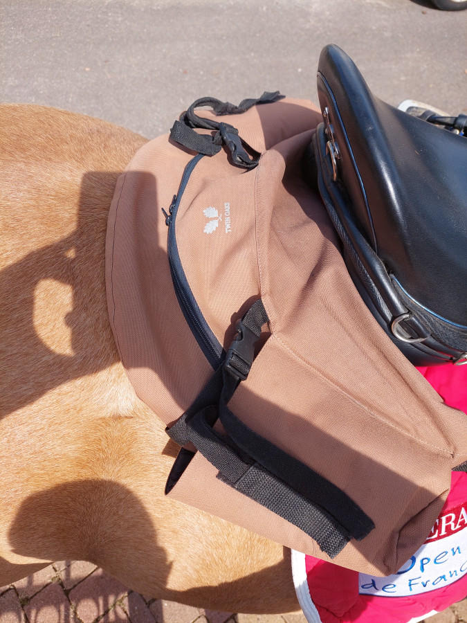 marjogirl-21 j'ai les mêmes sacoches et je mets la partie en tissu sous la selle, il y a donc juste mle boudin qui est derrière le troussequin et sur le tapis.