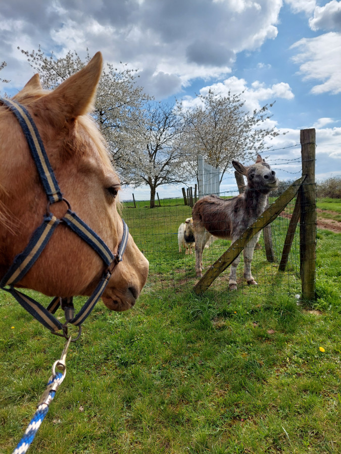 + 2.84 km aujourd'hui, et pas n'importe lesquels ! Nous avons fait notre première balade sans copain cheval avec nous (juste ma patate, le chien et moi). Jusqu'à présent, on arrivait à sortir un petit peu dans les deux chemins proches du pré, on broutait un peu (enfin elle surtout, moi pas des masses ah ah) et on rentrait.