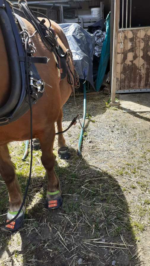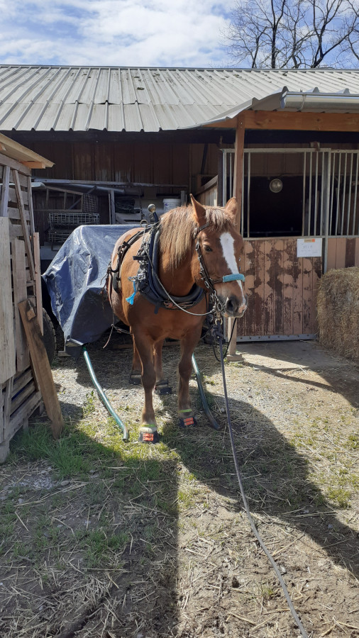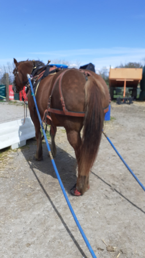 Pause, elle a regardé un peu derrière elle mais pas inquiète. Puis j'ai soulevé un peu les brancards pour voir si ça peut passer. Ça peut passer pour l'atteler mais comme ce n'était pas prévu et ce n'était pas le moment de tout faire "capoter" je les ai reposé .