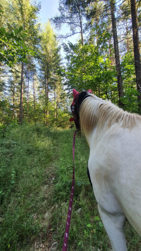 on est allé dans la forêt, pour commencer un petit trot, il est encore assez "poussif" au trot, sûrement son surpoids qui le gêne ;