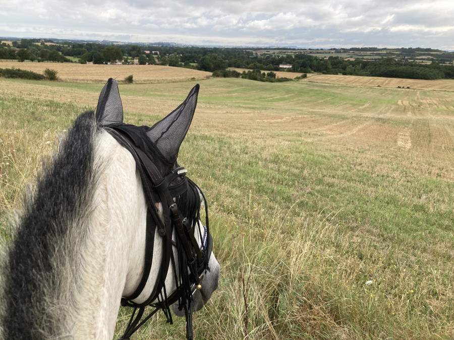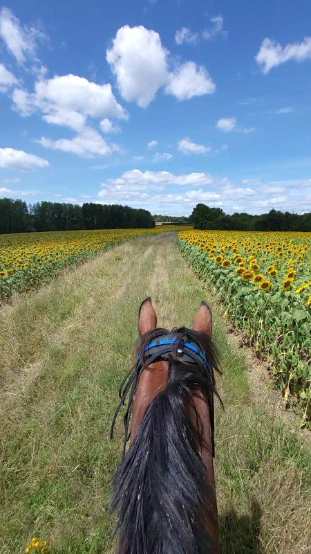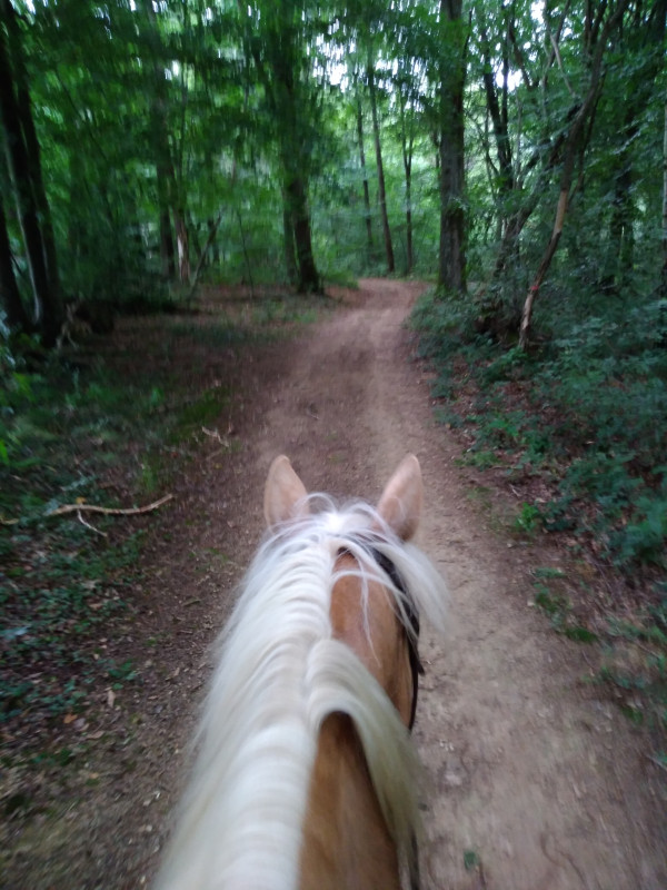 Sortie avec une autre des propriétaires de l'écurie, moi à cheval, elle a pieds avec son cheval.