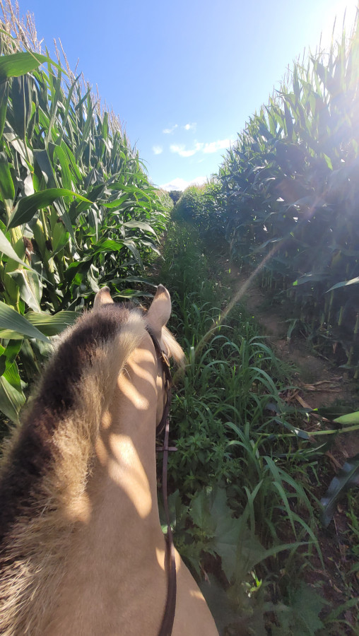 Le 1er parfait , joli chemin en herbe super sympa. Le 2eme superbe chemin mais... ça ne sort pas il manque 50 mètres le long d'un bois pour que ça puisse passer. Bon on ne voulait pas faire demi-tour donc on a décidé de traverser le maïs en marchant dans la travée de l'arroseur. Ouf ça nous a permis d'arriver pile au bon endroit sans faire demi-tour et sans goudron !