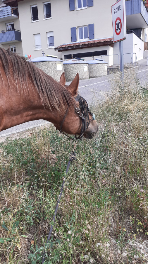 on a fait presque 10 km en main, il marchait bien, super allant et moi avec ma patte de canard boiteux (et l'ostéo qui est en vacances pdt mois ! ) j'avais du mal à le suivre (surtout qd je l'ai lâché, il faisait sa vie dans le bois et je traînais derrière). Puis il s'est "sauvé" dans un pré non clôturé, mais ahuri par toute la belle herbe verte, il a plongé le nez dedans sans pouvoir s'enfuir, je l'ai facilement ratrappé ! Sa gourmandise le perdra ! lol.