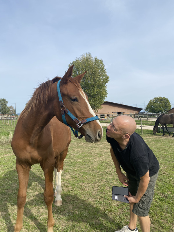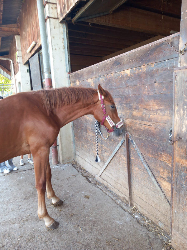 Niveau caractère c'est un chouette poulain, il est intelligent et curieux, assez respectueux pour l'instant.. Il sait marcher en main, il donne un peu les pieds, on commence le reculer.. bref, des trucs simples mais qui se passent bien donc j'en demande pas plus