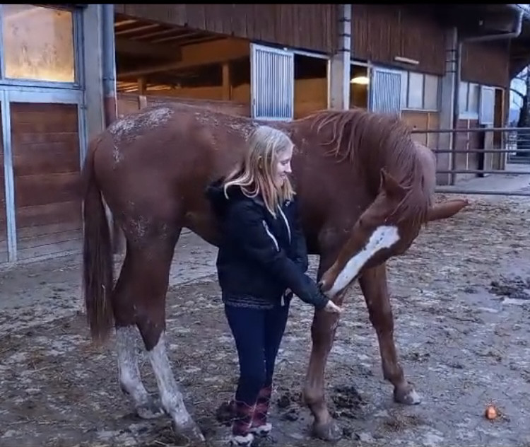 je commence à désensibiliser merlin au stick, c'était un peu la guerre pour lui mettre le licol parce qu'il est blessé donc il s'en méfie, mais finalement j'ai réussi, du coup j'ai pris mon stick et j'ai commencé à l'agiter devant lui. Au début ok donc je le touche gentiement avec toujours ok puis vers les fesses, sous le ventre etc, puis pareil de l'autre côté et la ca commence un peu à coincer donc j'ai été trop loin, on stoppe au moment où il se calme puis on finit par un exercice connu (reculer) à l'aide du stick pour lui montrer que c'est un objet commun, il répond bien à ma demande donc on félicite et laisse la dessus Je suis contente car tout me paraît si simple avec lui que là au moins j'ai vraiment l'impression de lui apprendre quelque chose