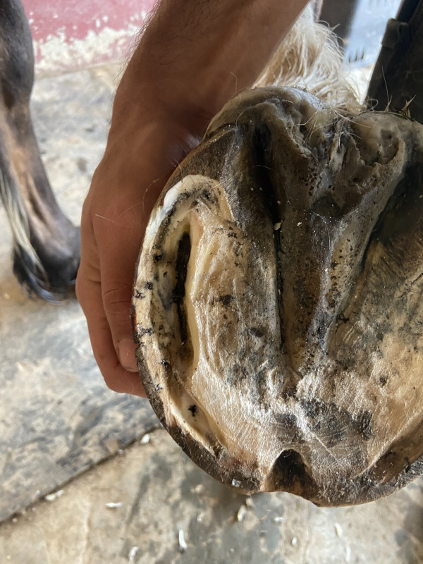 Alors après avoir sondé partout Caprice réagissait à n'importe quel endroit. Et ça a fini par percer en sole mais sur le bord au niveau d'un trou de clou. Bon il boitait encore à patte cassée en revenant au pré mais si ça se draine bien .. ça devrait aller. Le trou est rikiki donc ça explique que ça ait été long à sortir je pense ça a du rentrer quand il a deferré et que le clou l'a gêné.