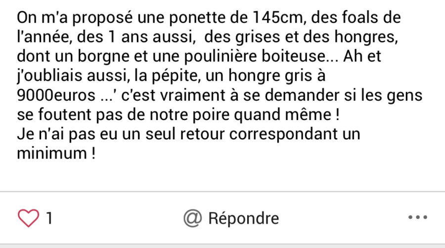 le but aussi de prendre un jeune (selon moi du moins) c’est de pouvoir prendre son temps et le travailler à sa façon, donc un petit de 2 ans qui a déjà été bossé relativement intensivement (parce que pour mettre un cavalier dessus y a un minimum de boulot avant) c’est pas trop le même esprit. Pour moi on dirait plutôt des pratiques d’un marchand peu scrupuleux qui fait ça pour s’en débarasser au plus vite, donc méfiance ++. J’espère avoir tord, mais on sait que tous les pros du commerce de chevaux ne sont pas des anges…