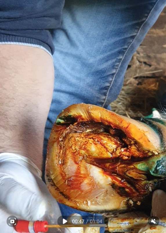 Décision plus radicale en vu de l'état de la jument, nous avons réalisé une ablutions partielle de la sole et de la parois afin du curer toute trace de tissus mort dans le pied.