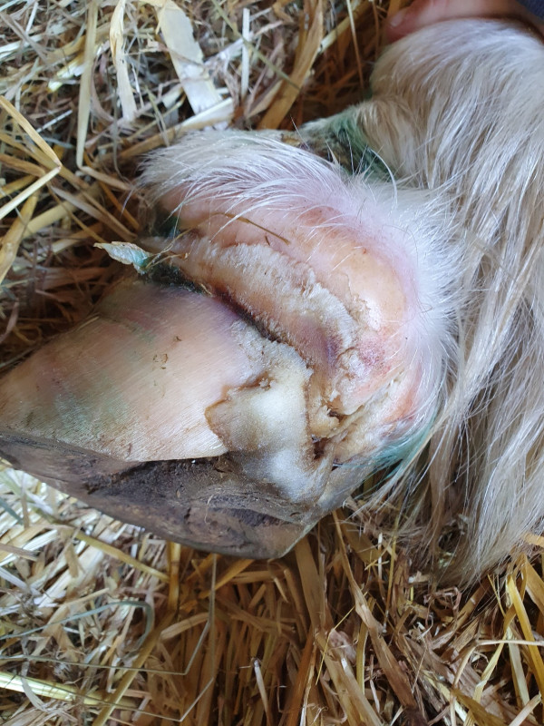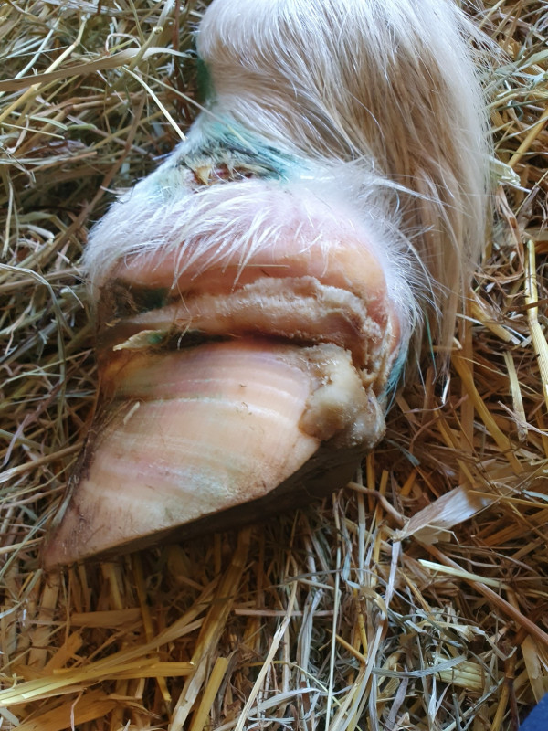 Elle est donc arrivée pour moi en myosite, pour le veto qui l'a vu le 4 au soir en fourbure. Bingo, c'était le deux. Le veto spécialiste équin décrit un syndrome d'épuisement, une myosite qui a produit tellement de toxine que fourbure... les 4 phalange ont basculées.