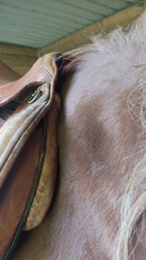 De mes selles actuelles c'est une vieille Norton qui lui va le mieux, au moins ça ne lui touche pas le garrot quoi